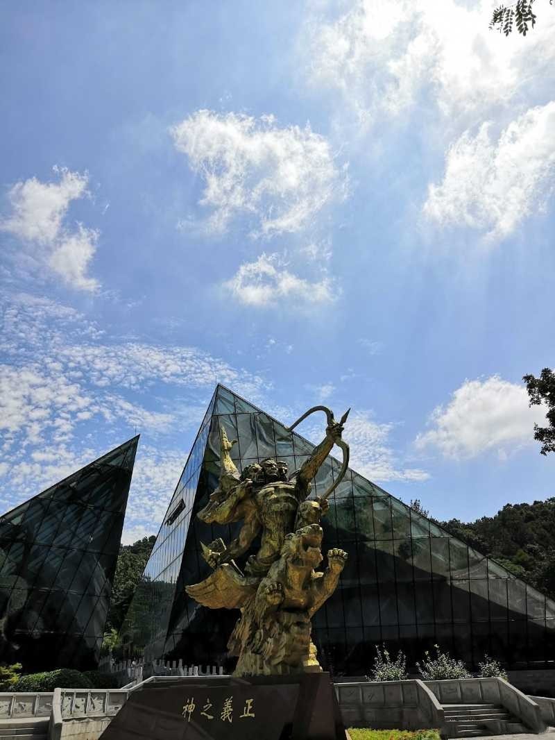 進(jìn)入紀(jì)念館大門(mén),青銅雕塑“正義之神”映入我們眼簾,三頭六臂的正義之神跨坐在飛天虎上,手中的利箭直指長(zhǎng)空。象征著中、蘇、美三國(guó)團(tuán)結(jié)一心聯(lián)合抗戰(zhàn)的決心和氣勢(shì),象征著國(guó)際統(tǒng)一戰(zhàn)線的戰(zhàn)無(wú)不勝的力量。一旁的紀(jì)念碑上鐫刻著兩列墓志銘:悍國(guó)騁長(zhǎng)空,偉績(jī)光照青史冊(cè);凱旋埋烈骨,豐碑美媲黃花崗。