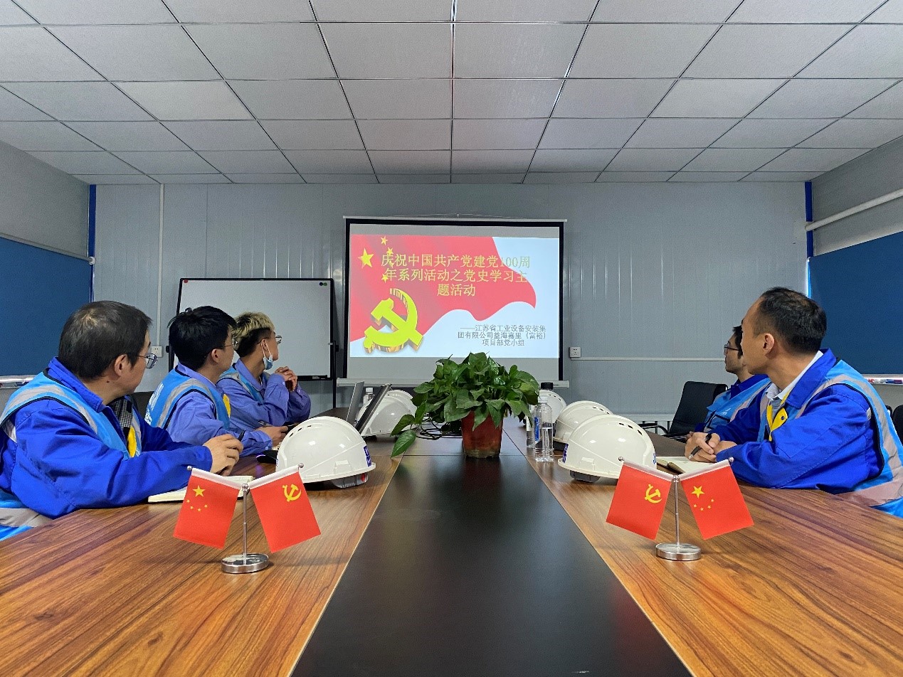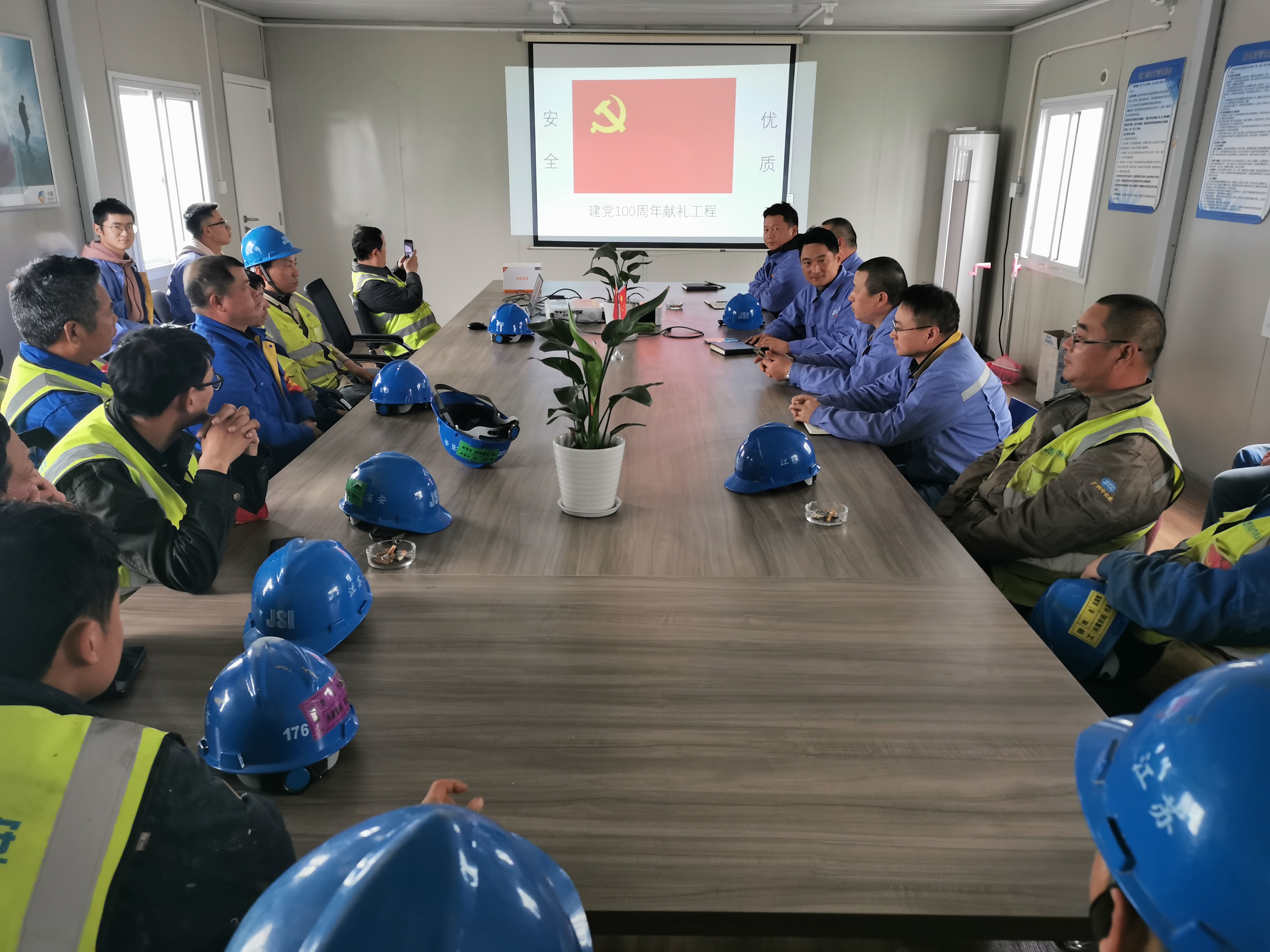 工業(yè)分公司黨支部張家港項(xiàng)目部經(jīng)理王俊峰組織現(xiàn)場(chǎng)的黨員和技術(shù)骨干進(jìn)行黨史學(xué)習(xí)教育,爭(zhēng)創(chuàng)優(yōu)質(zhì)工程,為黨的100周年獻(xiàn)禮!