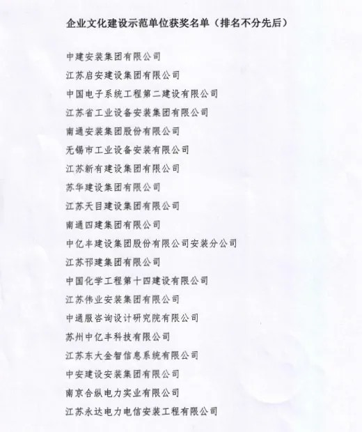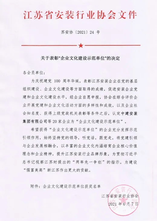 為慶祝建黨100周年華誕,江蘇省安裝行業(yè)協(xié)會(huì)表彰了一批在黨的基層組織建設(shè)和企業(yè)文化建設(shè)等方面取得成績(jī)的單位,江蘇省安榮獲企業(yè)文化建設(shè)示范單位稱(chēng)號(hào)。
