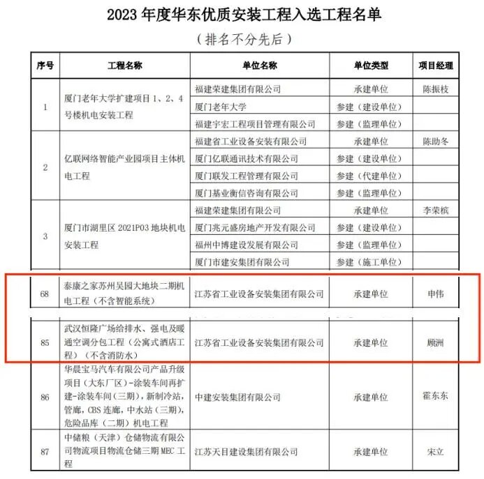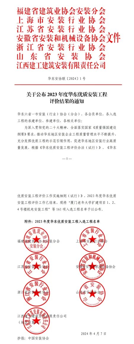 為深入貫徹黨的二十大精神,全面落實國家《質(zhì)量強國建設(shè)綱要》要求,我司努力推進優(yōu)質(zhì)工程建設(shè),積極響應(yīng)推動安裝行業(yè)高質(zhì)量發(fā)展的號召,以行業(yè)的規(guī)范標準為標準,積極參與各項評優(yōu)評先活動,在行業(yè)最近公布的“2023年度華東優(yōu)質(zhì)安裝工程”評選活動中,我司兩項工程榜上有名。