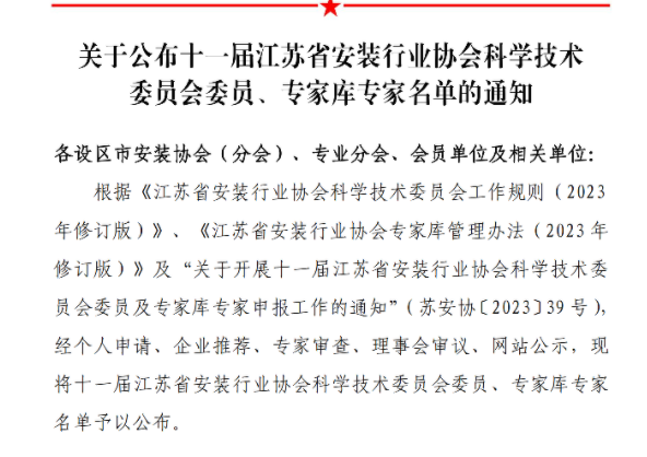 江蘇省安裝行業(yè)協(xié)會公布了十一屆江蘇省安裝行業(yè)協(xié)會科學(xué)技術(shù)委員會委員、專家?guī)鞂<颐麊?,我司多名人員榜上有名。