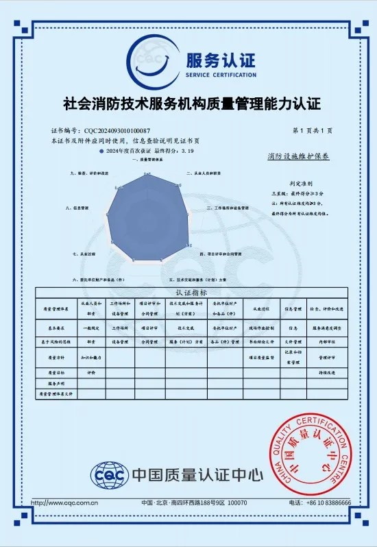今年,我司成功通過“消防技術(shù)服務(wù)機構(gòu)質(zhì)量管理能力認證”,該項認證標志著省安在消防設(shè)施維護保養(yǎng)工程領(lǐng)域的專業(yè)程度和質(zhì)量管理能力達到了新的高度。