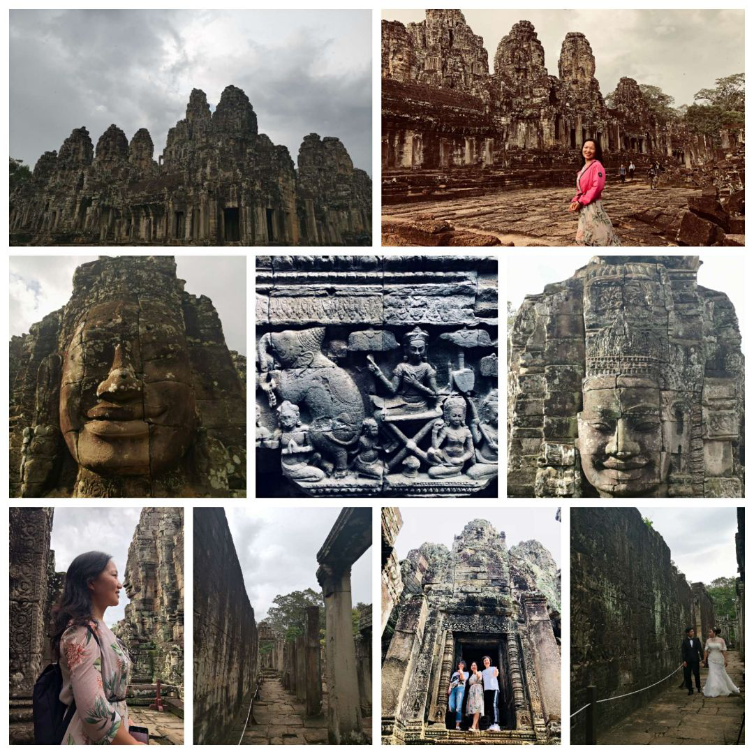 大吳哥城共有五座城門,城門高20公尺,城門上雕有四面佛像,世人稱之為【高棉的微笑】,隨后參觀由54座大大小小的寶塔構(gòu)成一座大寶塔的【巴戎廟】,位于王城的中心點(diǎn),由49座四面巨石佛群所組成,亦代表當(dāng)年版圖有49個(gè)諸侯領(lǐng)土,結(jié)構(gòu)上也是以宇宙為中心點(diǎn)發(fā)展,中間佛像位置很高,下一層則四周圍繞其他四面巨石佛群,穿梭其中猶如置身于佛陀的世界。游覽時(shí)遇見一對(duì)新人在拍婚紗照,現(xiàn)代與歷史完美地結(jié)合。