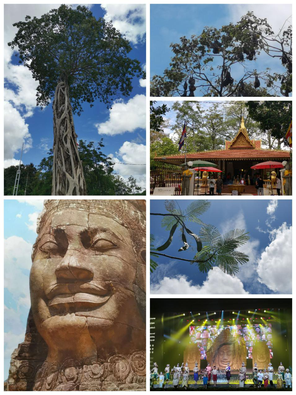 16日的行程很輕松,上午參觀了皇家公園、姐妹廟?;始夜珗@位于吳哥市中心,面積不大, 公園里面特別神奇的是,大樹上常年有巨大蝙蝠高掛在樹梢,彷佛相伴姐妹佛不舍離去,尤其是在清晨或是傍晚, 成千大蝙蝠盤旋空中的景象, 真叫人嘆為觀止。下午參觀了吳哥全景博物館,吳哥全景博物館是柬埔寨和朝鮮合作完成, 再現(xiàn)了吳哥的興衰,360度全景讓肉眼產(chǎn)生了錯(cuò)覺,仿佛置身其中,很震撼!晚飯后欣賞了高棉民族舞蹈,演員們精彩的表演贏得觀眾陣陣掌聲。