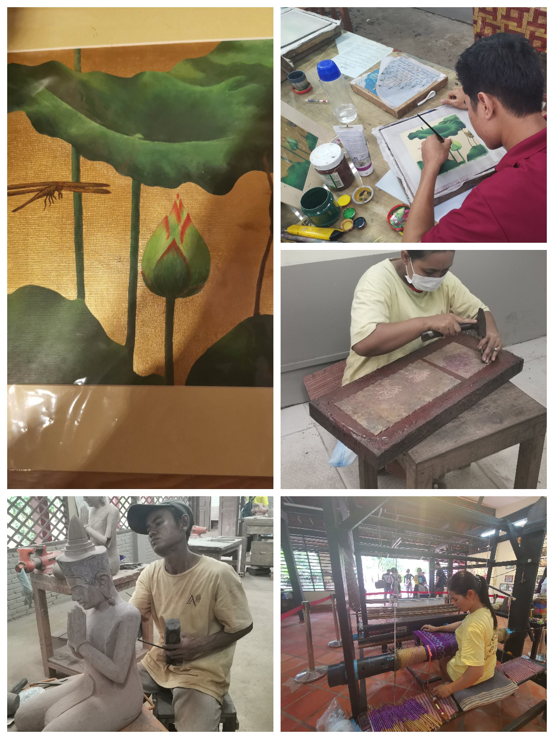 今天(18日)是在柬埔寨的最后一天,早晨睡到自然醒。之后參觀了一所技術(shù)學(xué)校,主要是為柬埔寨農(nóng)村人培養(yǎng)傳統(tǒng)的手工技能,如木雕、石雕、絲綢畫等。手工作坊較簡(jiǎn)漏,師傅門也沒有任何防護(hù)措施。