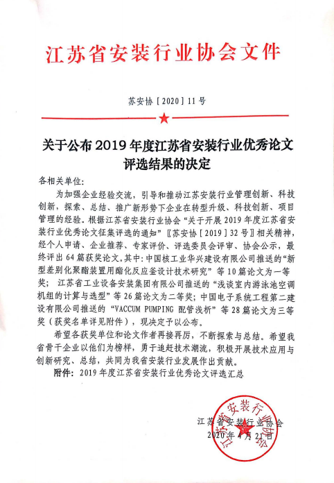 【鏈接】http://www.jsaz.com.cn/Web/Web/PicCon?id=490&type=014034036&sort=1&code=014034關(guān)于公布2019年度江蘇省安裝行業(yè)優(yōu)秀論文評(píng)選結(jié)果的決定